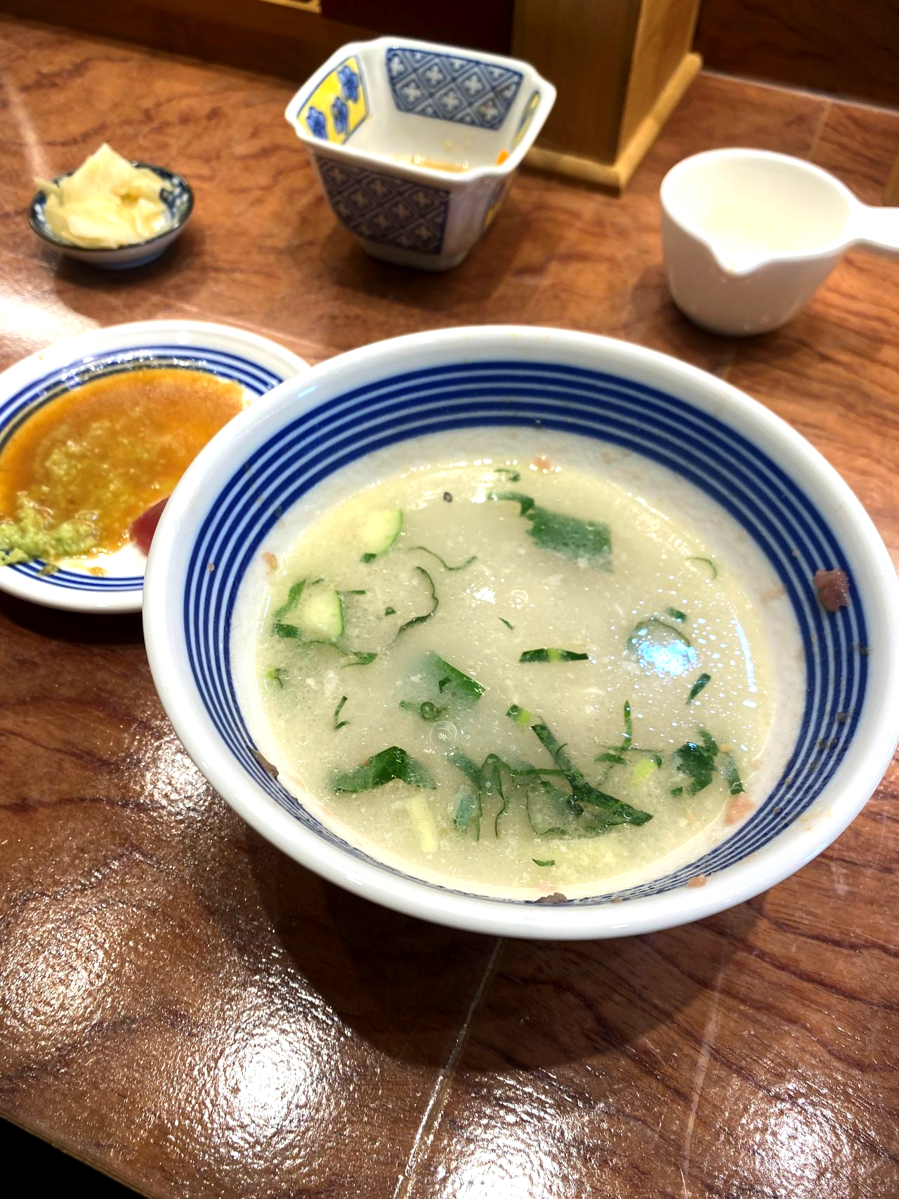 3. 덮밥을 거의 다 드시고 약 2 스푼 정도 남았을 때, 덮밥 그릇을 상판 위로 올려주면 주방장님께서 육수를 부어 오차쯔께 해주십니다. 이때 덮밥을 다 드셨다면 흰밥을 제공해준다고 합니다^^