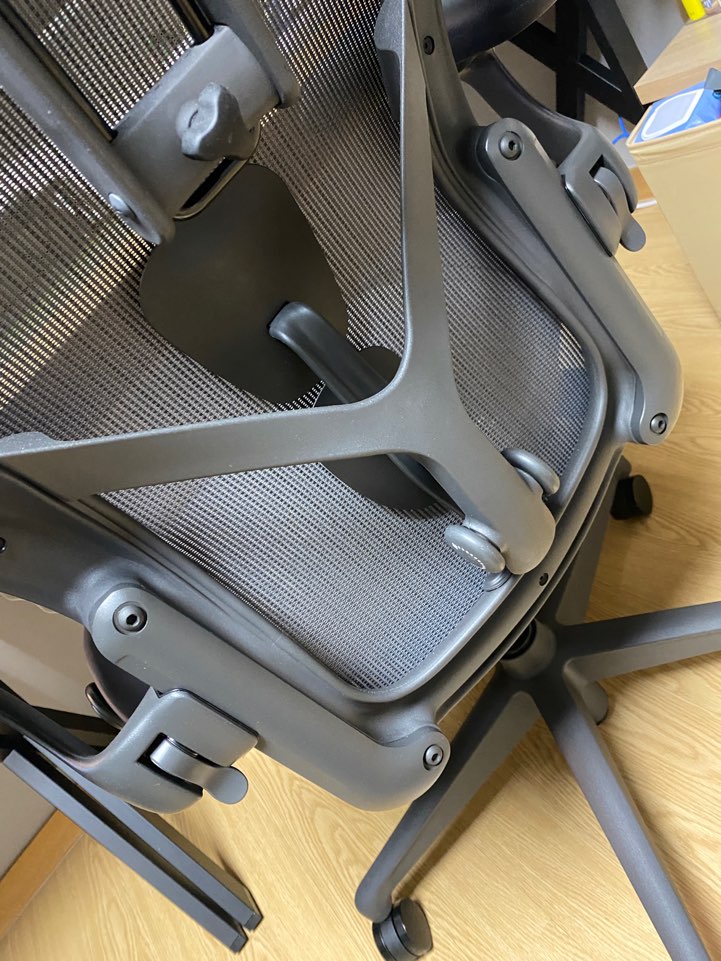 저는 의자는 당연히 뒤로 제껴져야 한다고 생각했습니다. 컴퓨터를 하면서 타자를 칠 때 자세가 살짝 뒤로 눕혀지는 게 편하거든요. 하지만 허먼밀러는 완벽한 사무용 의자기 때문에 90도에 맞춰진 자세를 정말 편안하게 잡아주는 게 목적인 것 같습니다. 거기서 더해서 사용자가 글을 쓰는 등의 자세로 몸을 앞으로 기울일 때도 의자가 앞으로 숙여서 자세를 잡아줄 수 있는 기능이 있습니다.