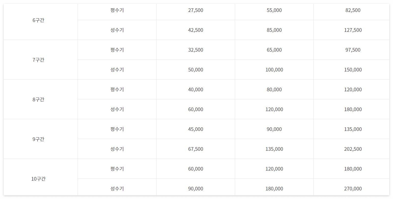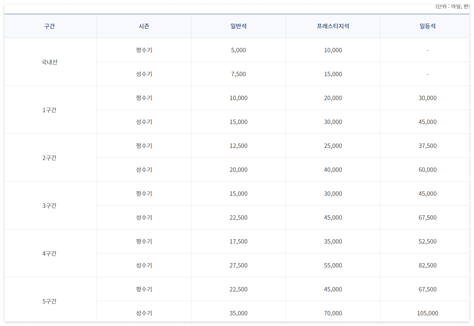 4월 1일 이후 마일리지 공제표(단위: 마일, 편도 기준)