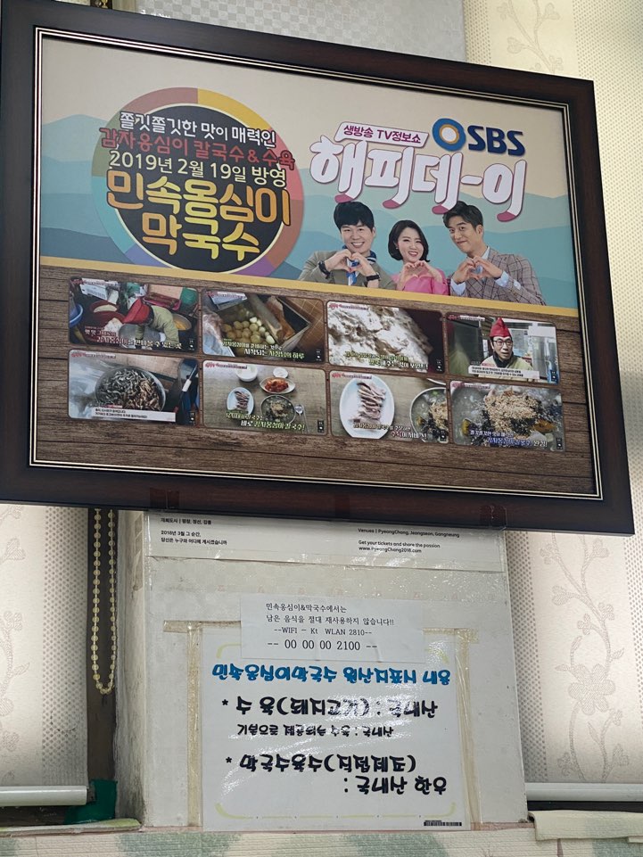 막국수, 옹심이, 수육이 메인으로 보입니다.
