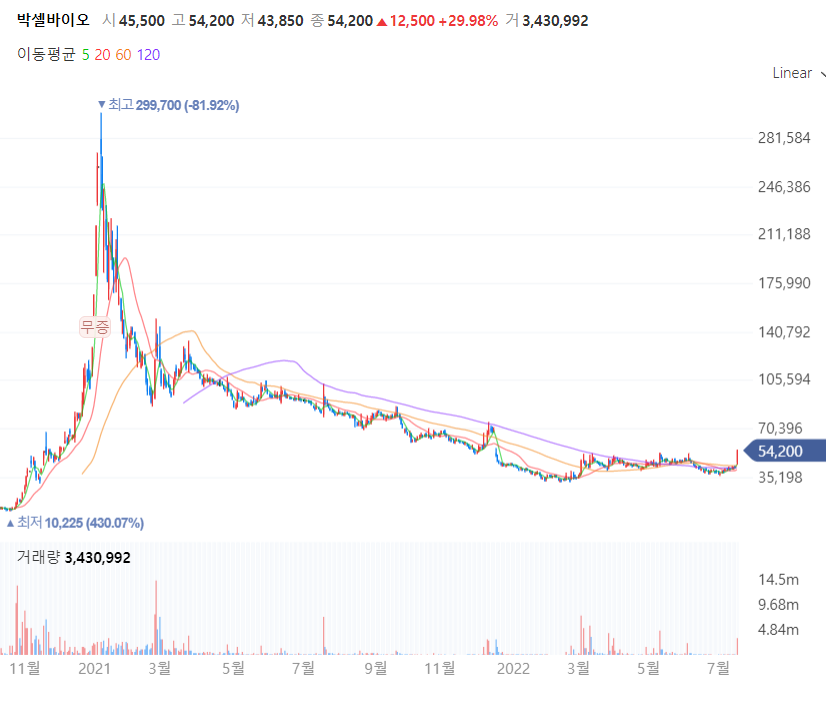 박셀바이오는 상장 후 최소 30만 원 가까이 급등했던 기록이 있습니다.