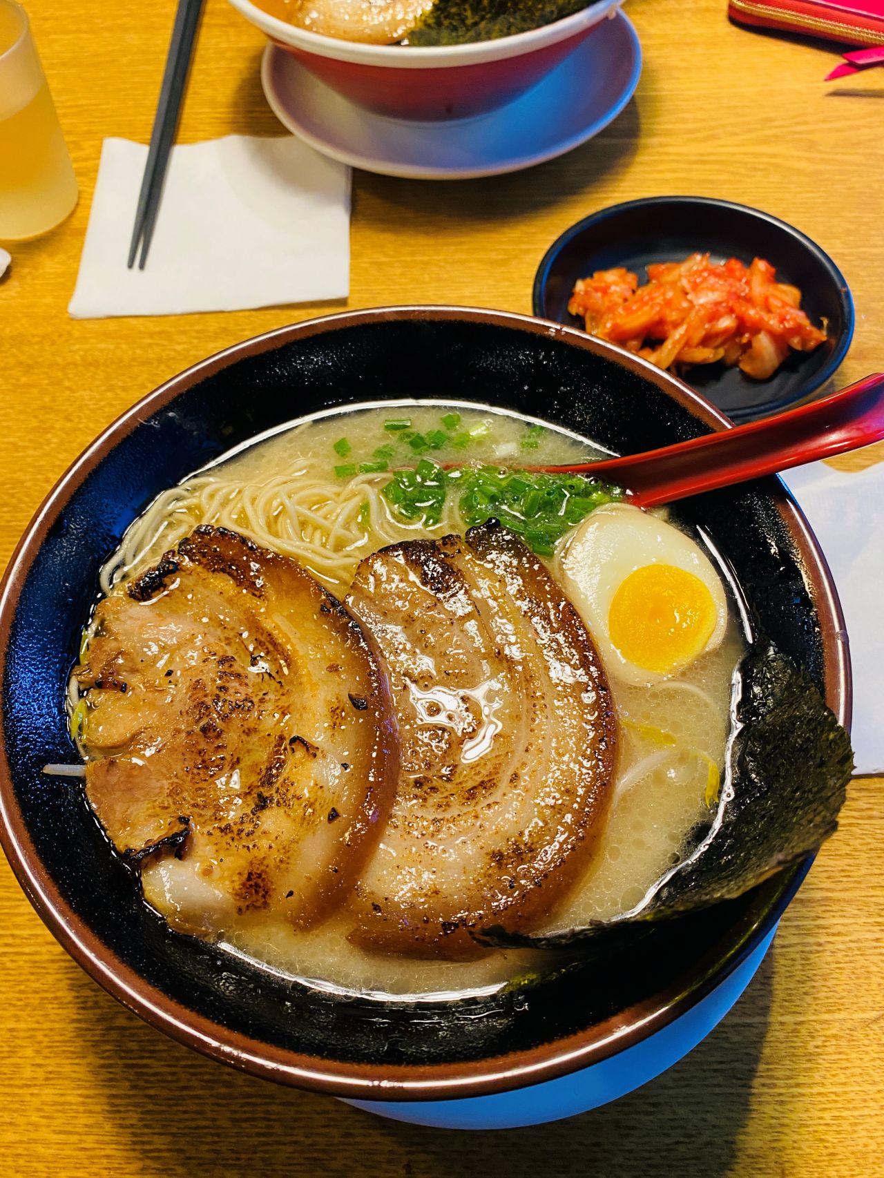 초라멘은 진한 돼지 사골육수에 가쓰오 풍미를 더해 약간 매운 돈코츠 라멘입니다.