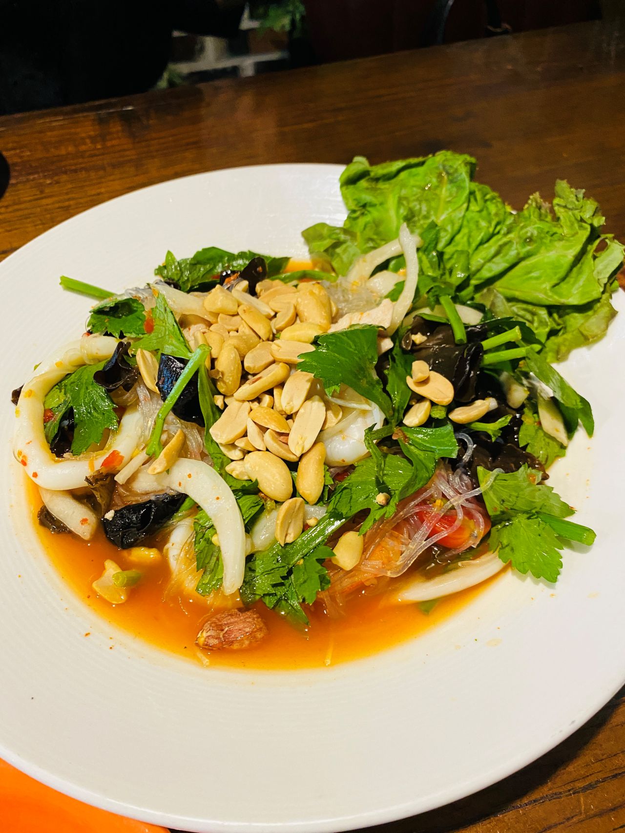 새우, 오징어, 닭고기를 곁들인 태국식 당면 샐러드입니다.