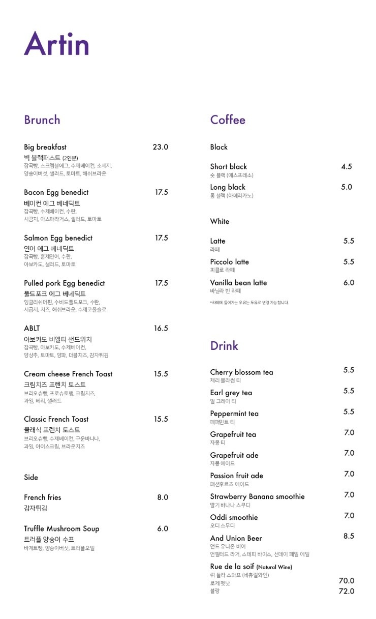 아르틴 메뉴, 출처 :네이버 지도