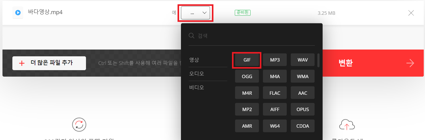 MP4 파일을 드래그하고 가운데... 버튼을 누르면 파일 유형을 고를 수 있습니다.