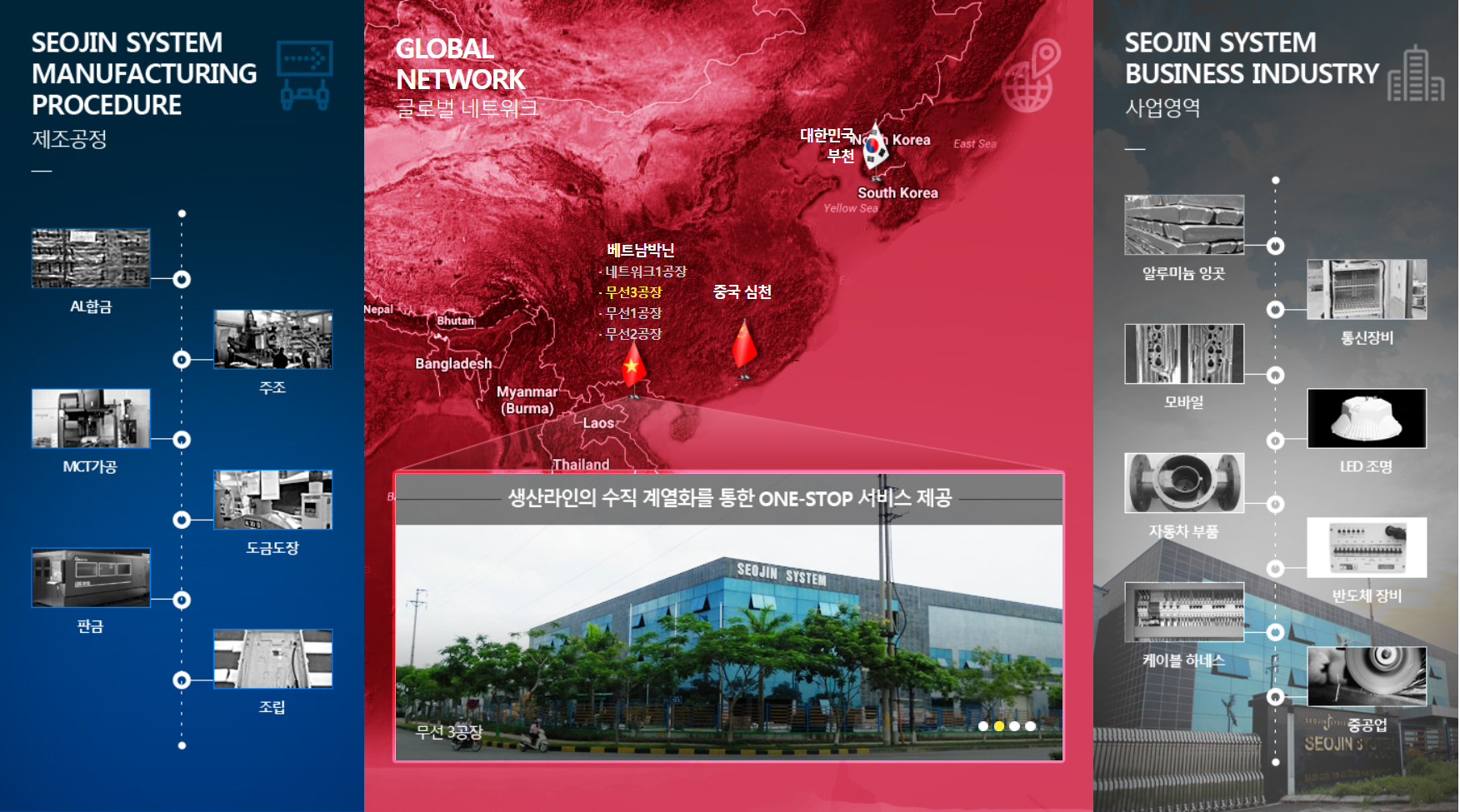 - 종속회사를 생산거점으로하여 베트남 공장 및 설비 투자를 통해 자동차부품 및 전기자동차 부품을 일부 양산하고 있으며, 추가적으로 개발 및 양산 준비중에 있음.