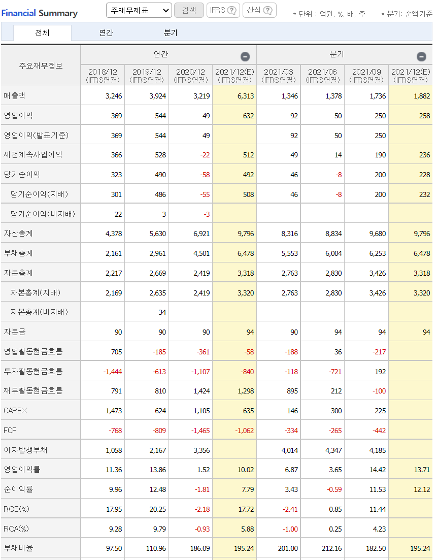 2021년 3분기부터 매출과 영익은 실적으로 찍히고 있다.