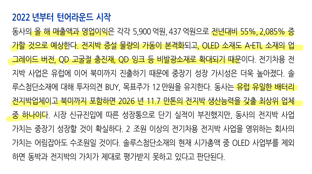 전지박 사업부는 단계별 양산/공급 증가 중이며, 첨단소재사업부도 QD 디스플레이 신규 소재 및 천연 세라마이드의 독보적인 시장 경쟁력을 바탕으로 매출 성장 시현.