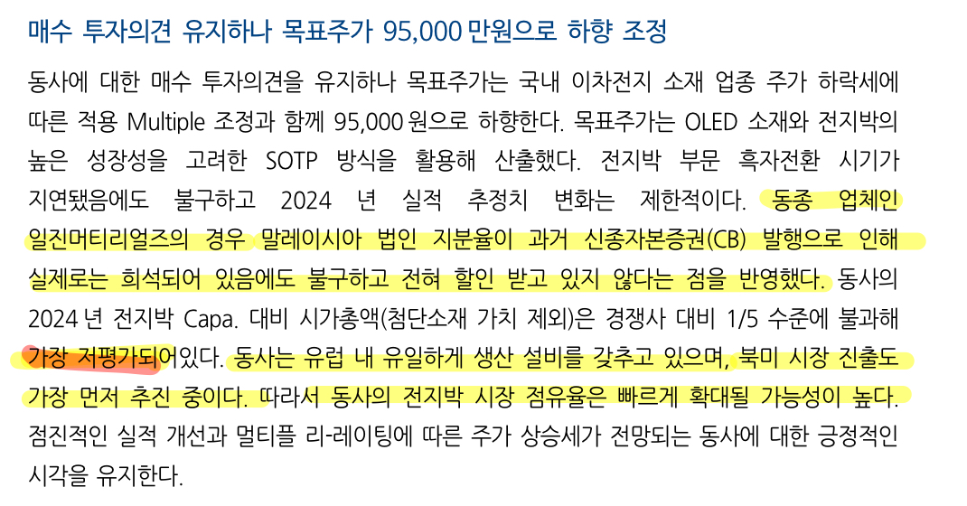 목표가 산정에 일진머티리얼즈를 고려했다고 한다.
