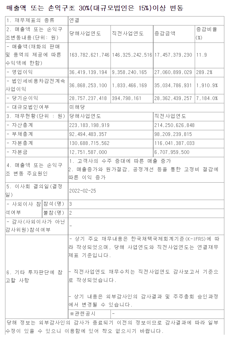 매출액 또는 손익구조 30%(대규모법인은 15%)이상 변동 건이 올라왔다.