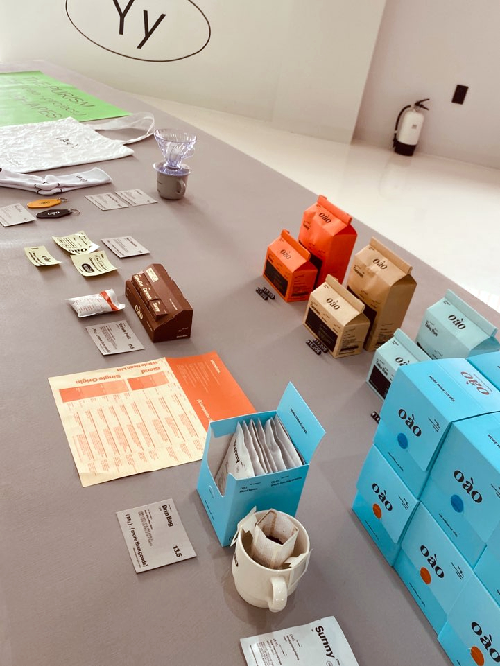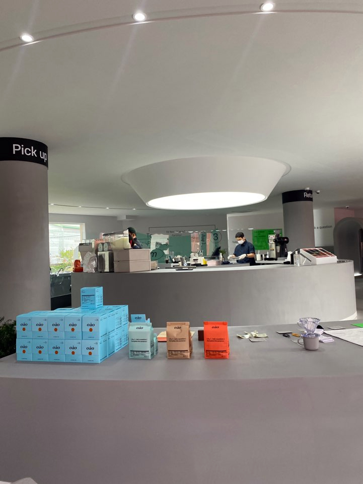 오아오에서 제작한 원두와 커피 관련 용품, 저 멀리 에코백과 양말도 보이네요.