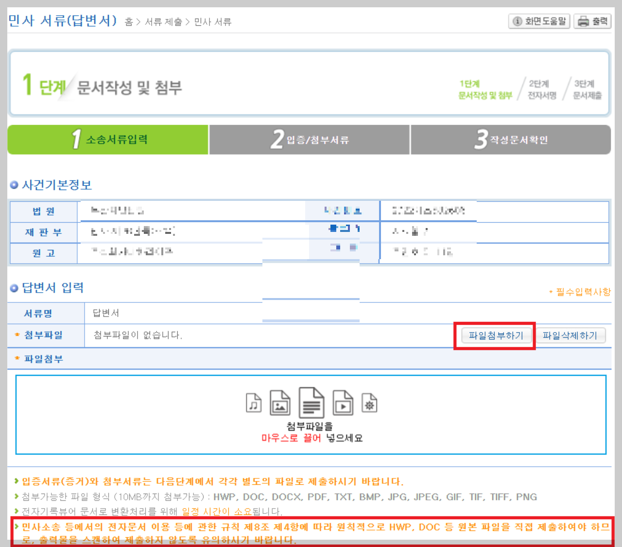 민사소송 등에서 전자문서 이용 시 "규칙 제 8조 제4항에 따라 원칙적으로 HWP, DOC등 원본 파일을 직접 제출하여야 하므로, 출력물을 스캔하여 제출하지 않도록 유의하시기 바랍니다" 안내 메시지가 있습니다.
