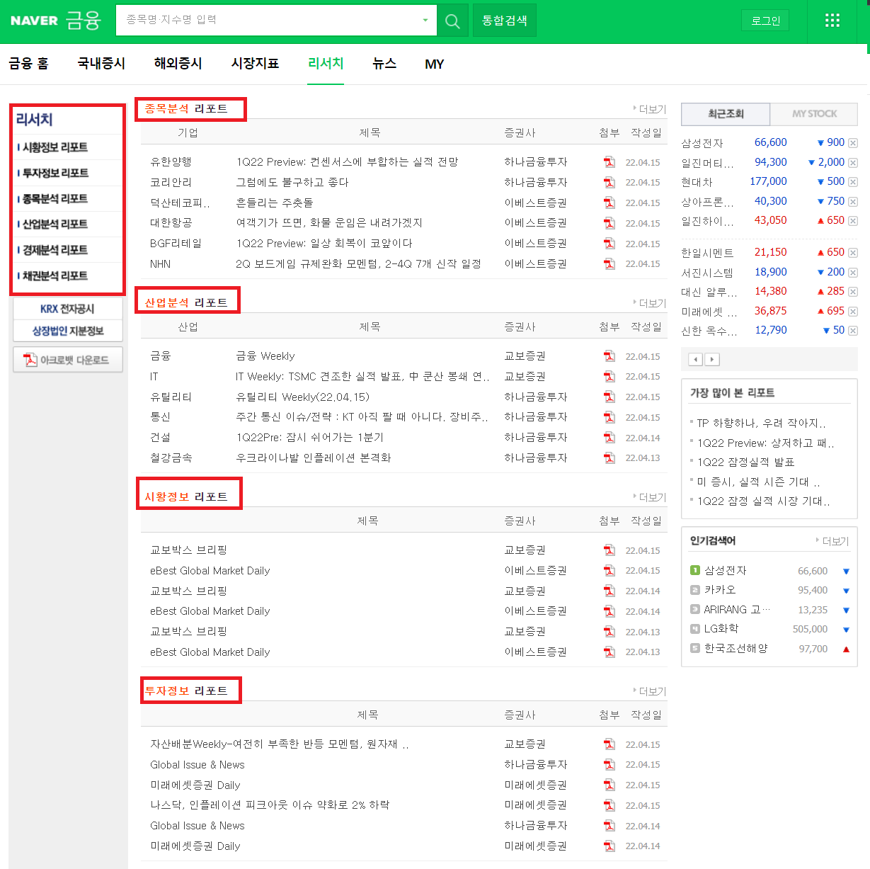 네이버 증권에서도 각종 리포트가 정리되어 있습니다.