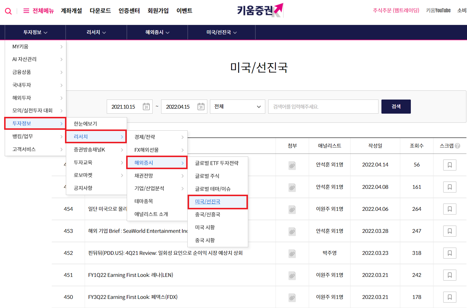 - 투자정보 > 리서치 > 해외증시 > 미국/선진국