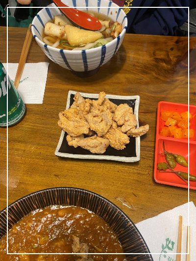 오늘은 오뎅우동과 카레라이스, 그리고 가라아게를 시켰습니다.