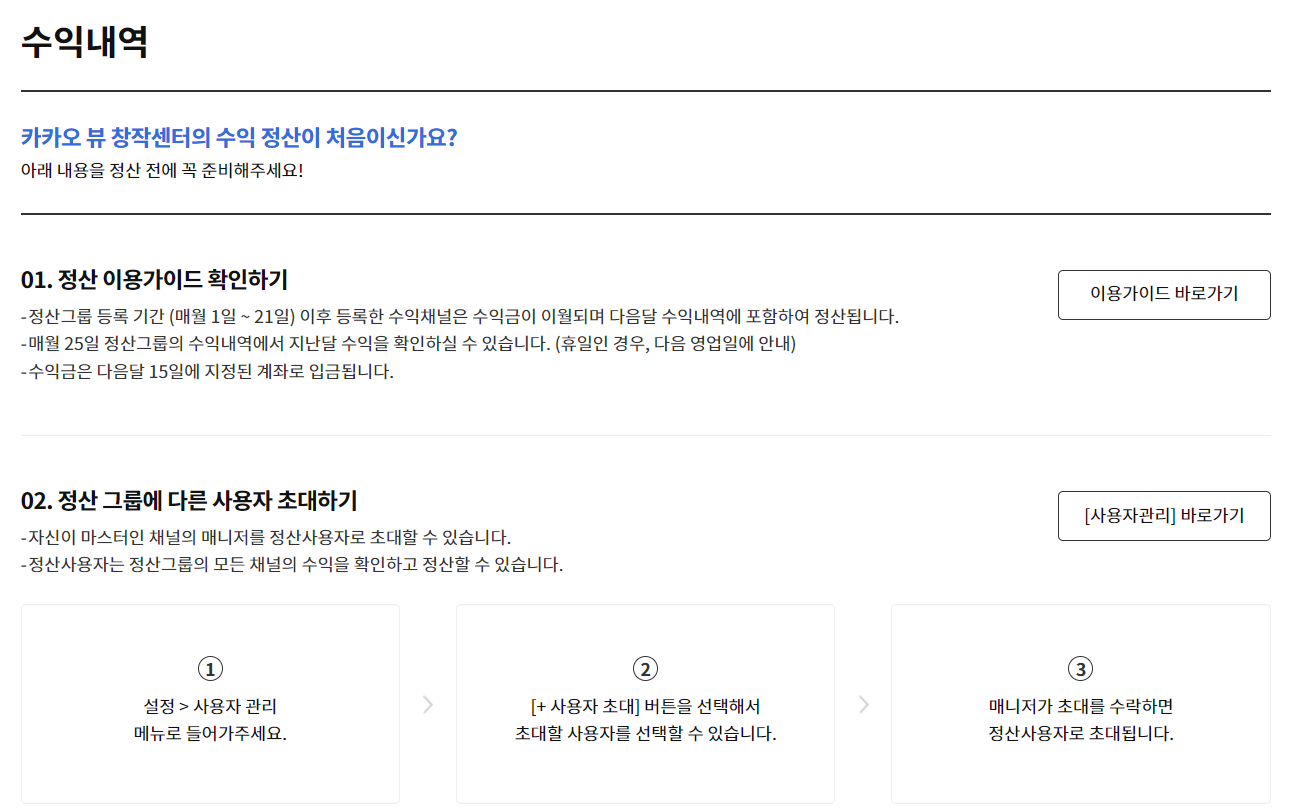 매월 25일에 정산 그룹의 수익 내역에서 지난달 수익을 보여준다고 합니다.