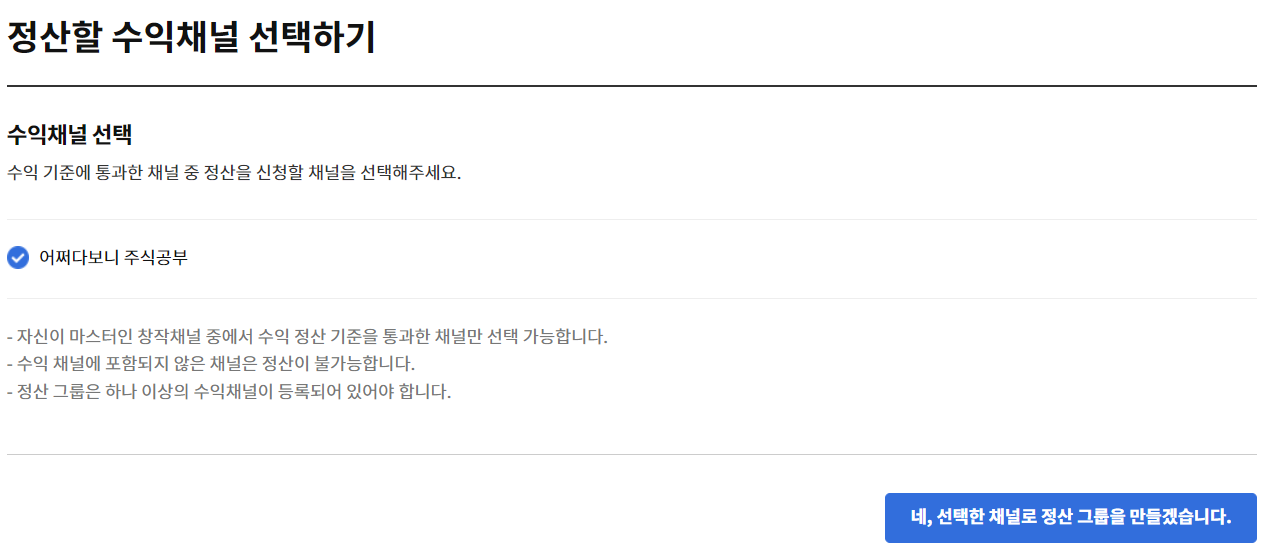 정산 그룹 등록기간 (매월 1일 ~ 21일) 이후에 등록된 수익 채널은 이월되어서 수익 내역에 정산됩니다.