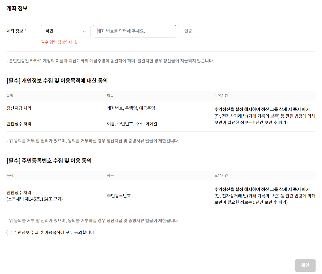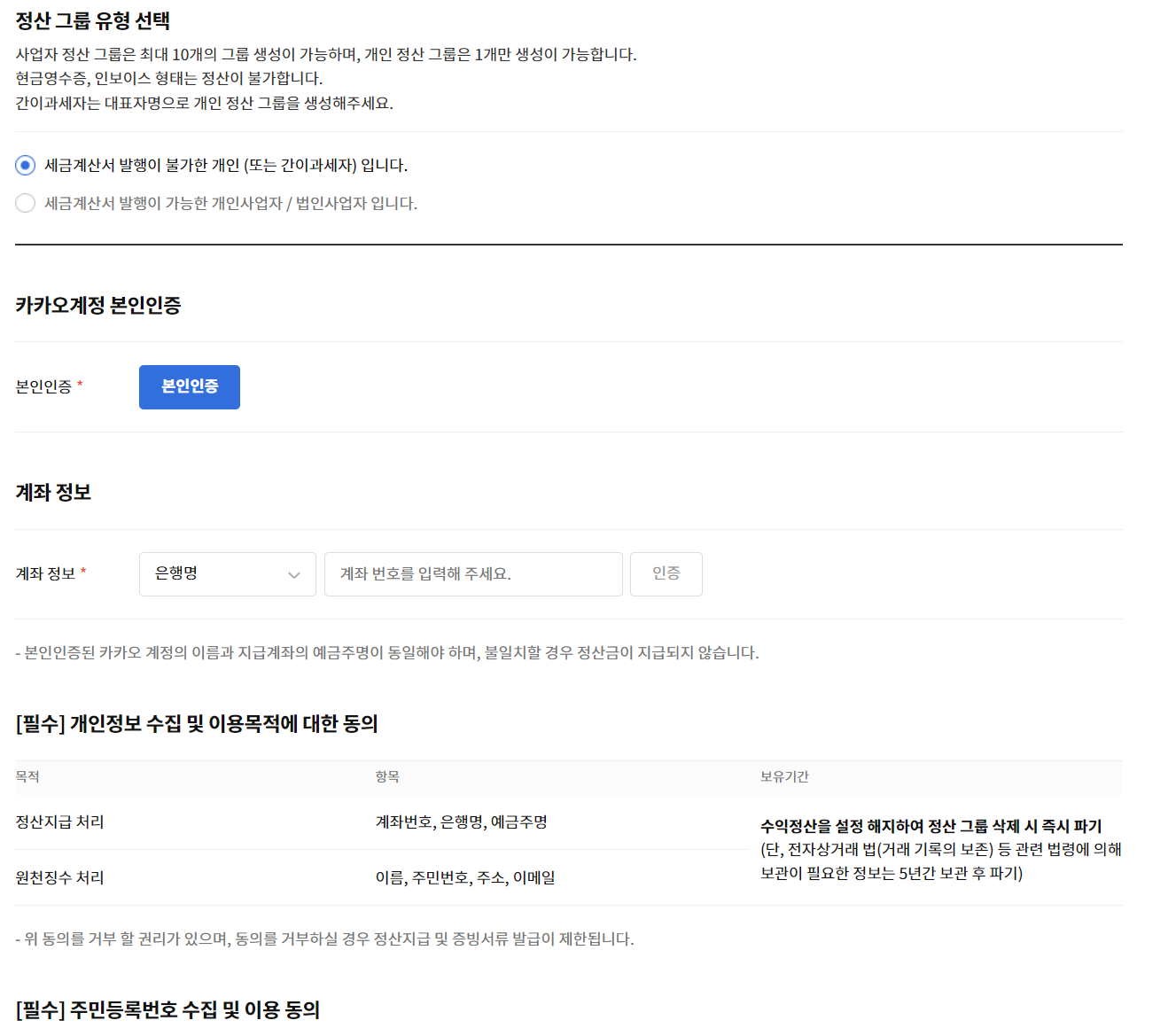 +사업자 정산은 세금계산서 역발행을 원칙으로 하며, 정산 진행을 위해 트러스빌 가입이 필요합니다. 역발행 세금계산서 발급 비용은 카카오에서 부담합니다.