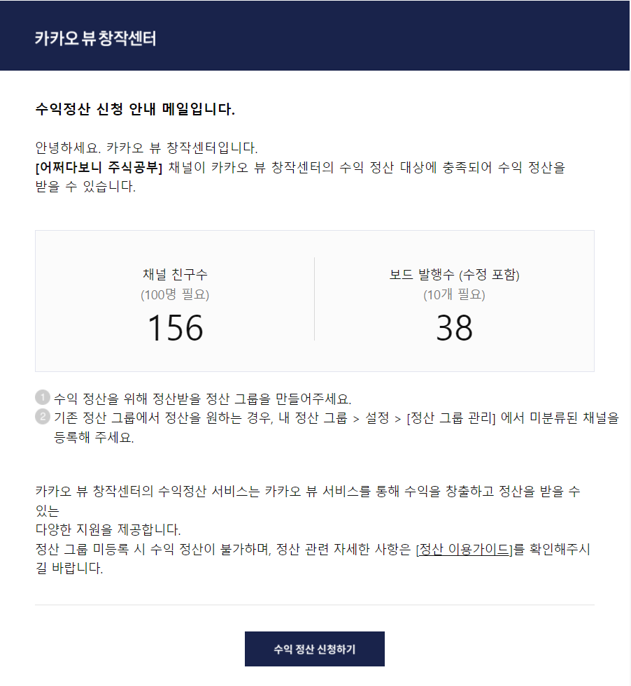 드디어 카카오 뷰 창작센터에서 수익정산을 받을 수 있다는 메일이 왔습니다.