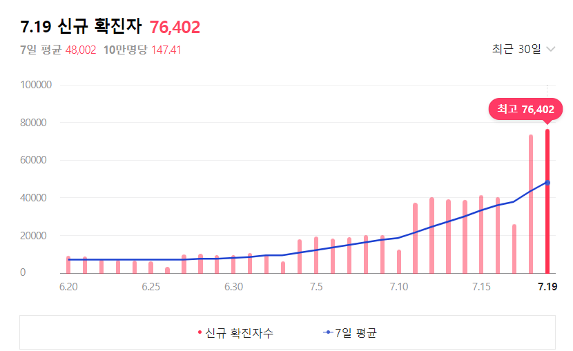 코로나 확진자수가 최근 30일 데이터를 봤을때 최고치를 찍었습니다.