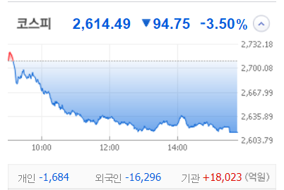 코스피 3.50% 급락한 2,614.49 마감…14개월만에 최저