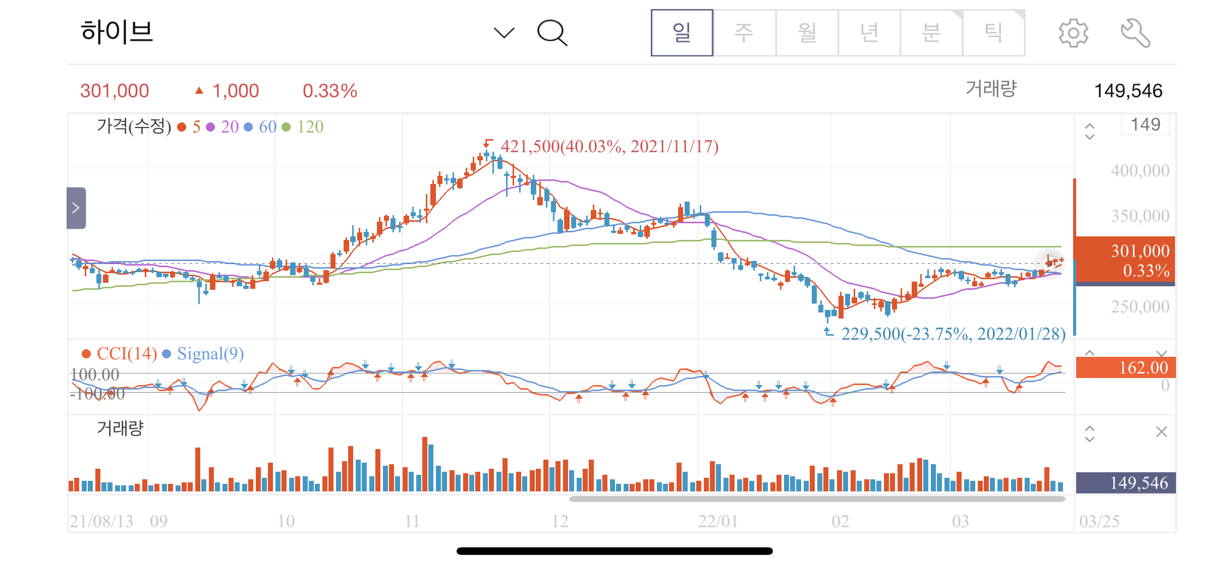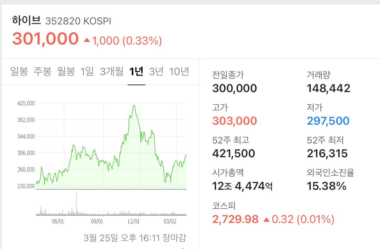 3월 25일 종가 기준 301,000원