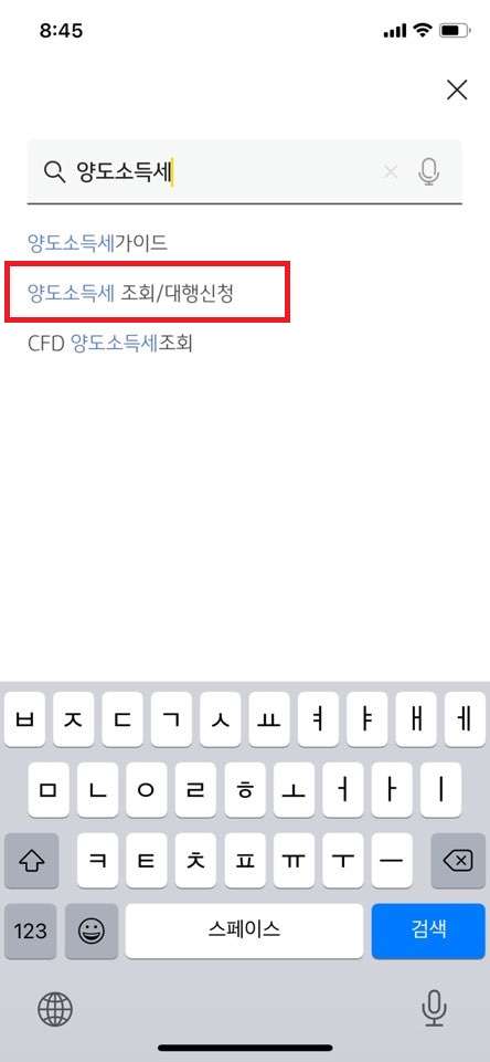 - KB증권 MTS, 메뉴 검색에서 "양도소득세 조회/대행신청"을 선택합니다.