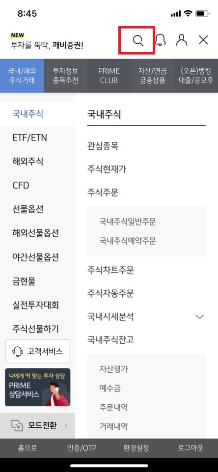- KB증권 MTS, 메뉴 검색에서 "양도소득세 조회/대행신청"을 선택합니다.