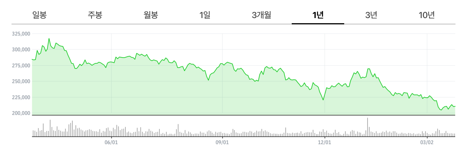 현대 모비스 차트를 보면 최근 1년 동안 하향곡선을 그리고 있다.