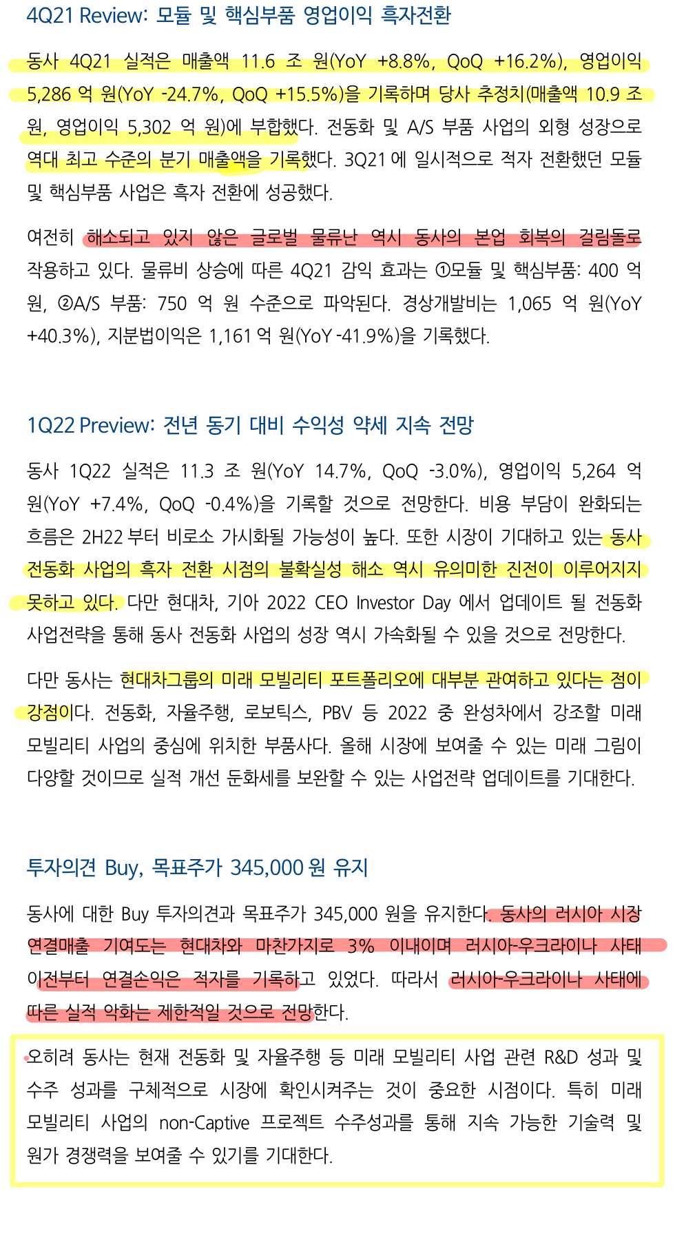 모듈 및 핵심부품 영업이익이 흑자전환에 성공했고 전동화 및 a/s 부품 사업의 외형 성장으로 역대 최고 수준의 분기 매출액을 기록했다는 것이다. 21년 3분기에 일시적으로 적자 전환했던 모듈 및 핵심부품 사업이 흑자 전환에 성공했다고 한다.