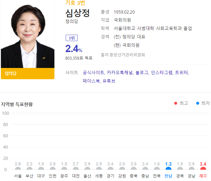 정의당 심상정 후보는 803,358표로 2.4%입니다.