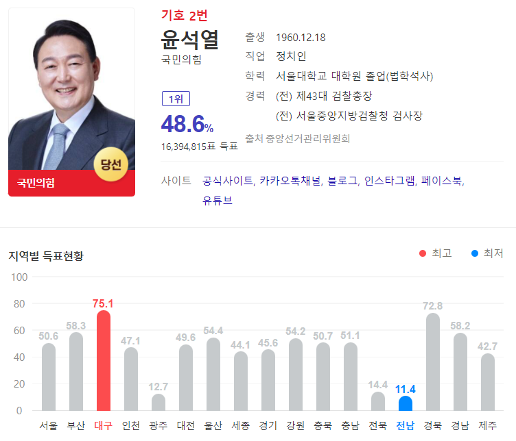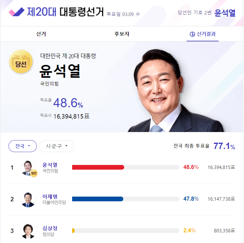국민의힘 윤석열 당선인은 16,394,815표로 48.6%