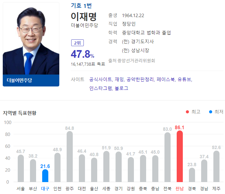 더불어민주당 이재명 후보는 16,147,738표로 47.8%