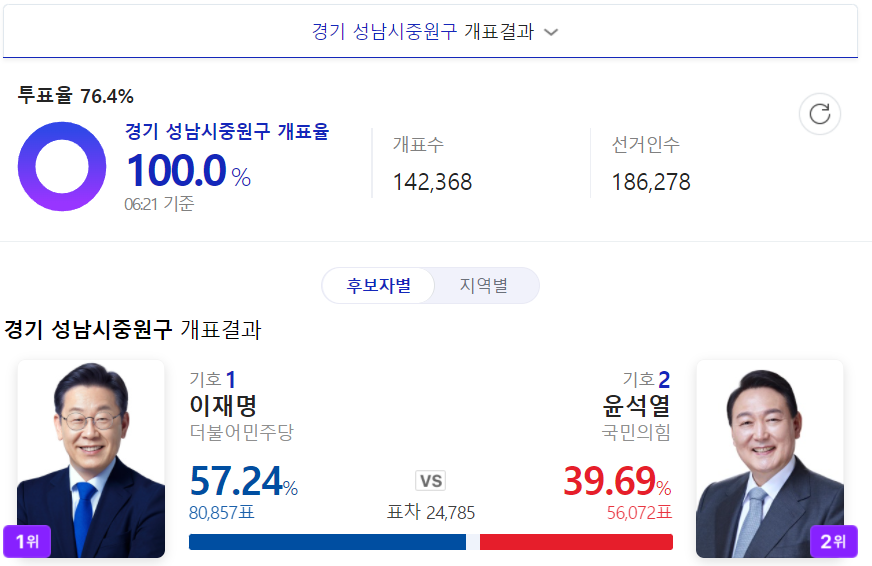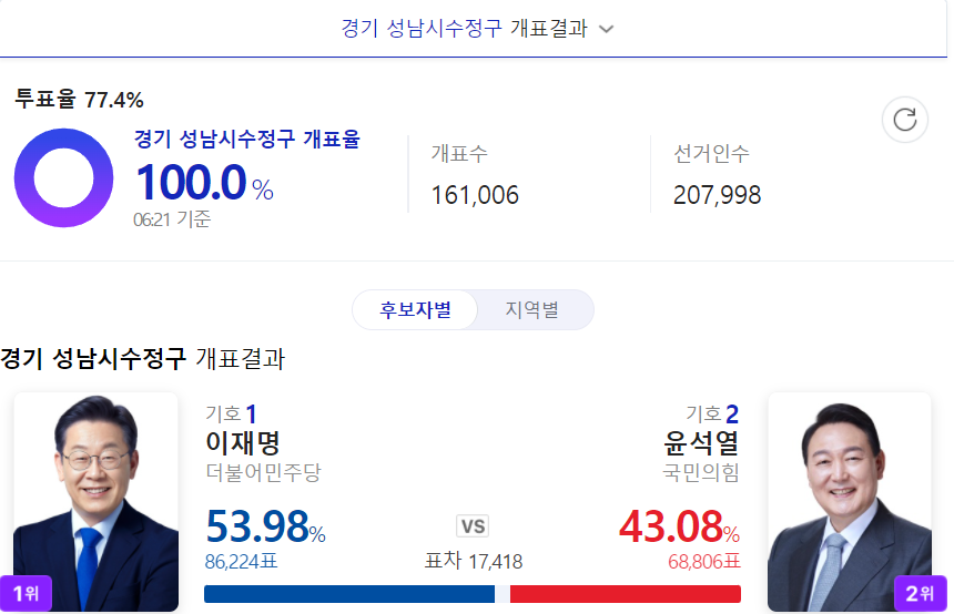 성남시 수정구는 투표율 77.4%로 이재명 후보가 10% 정도 앞섰네요.