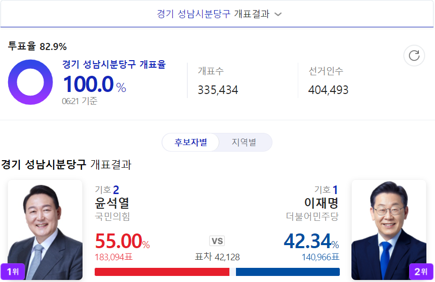 분당구에서의 투표 결과가 윤석열 후보에 대한 지지가 높았습니다.