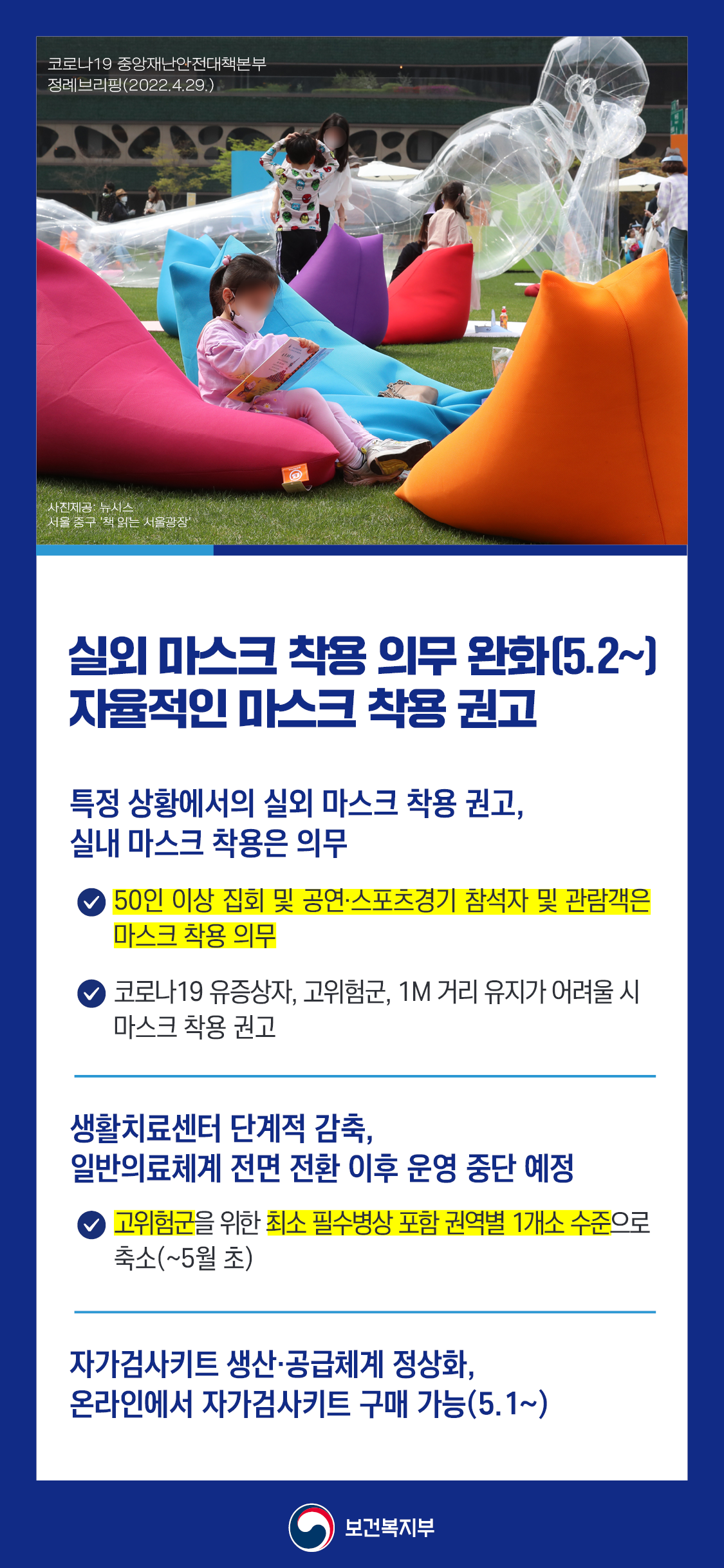 실외 마스크 착용 의무 완화(5.2~) 자율적인 마스크 착용 권고