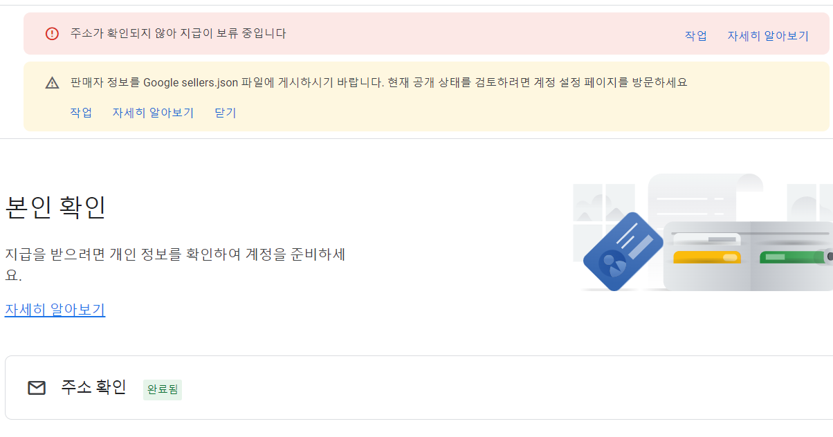 상단의 "주소가 확인되지 않아 지급이 보류 중입니다" 메시지는