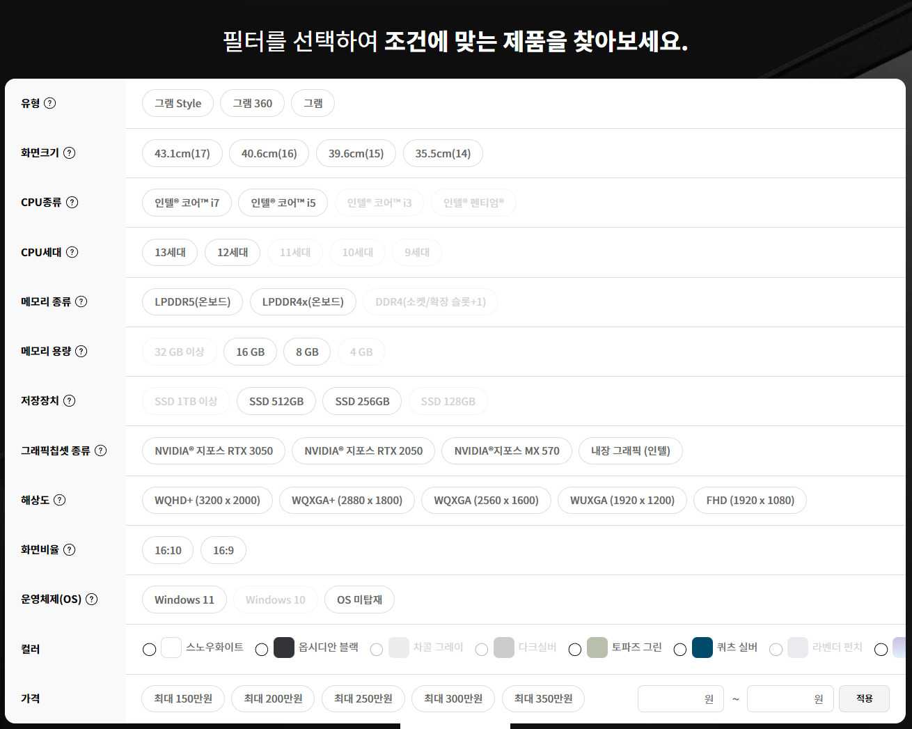 LG전자에서는 내가 원하는 필터를 선택하면 거기에 맞는 스펙의 제품을 추천해주고 있습니다.