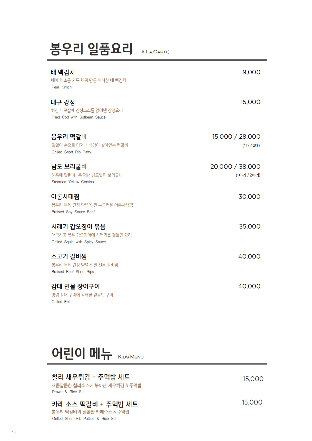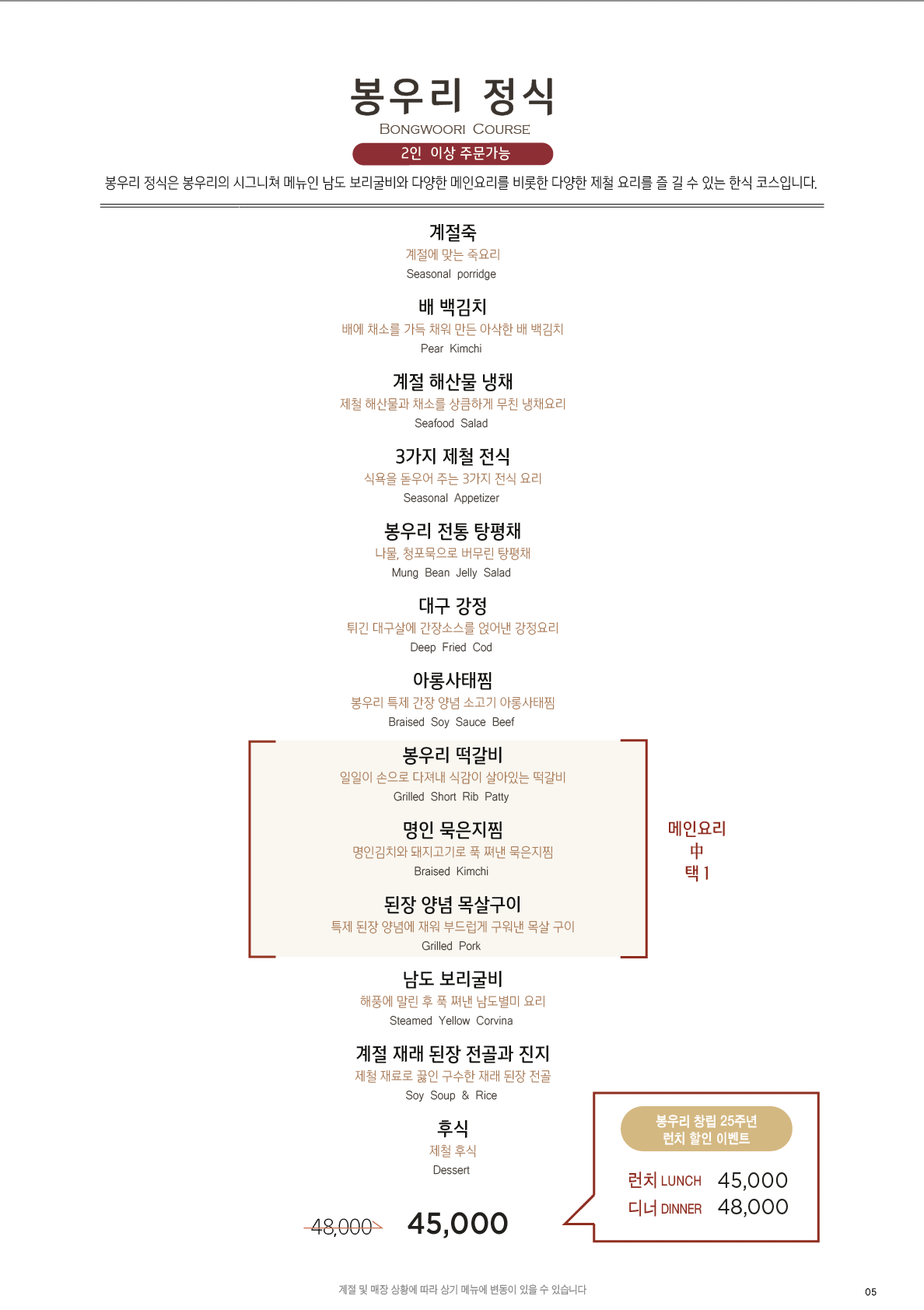 봉우리 한정식 메뉴판