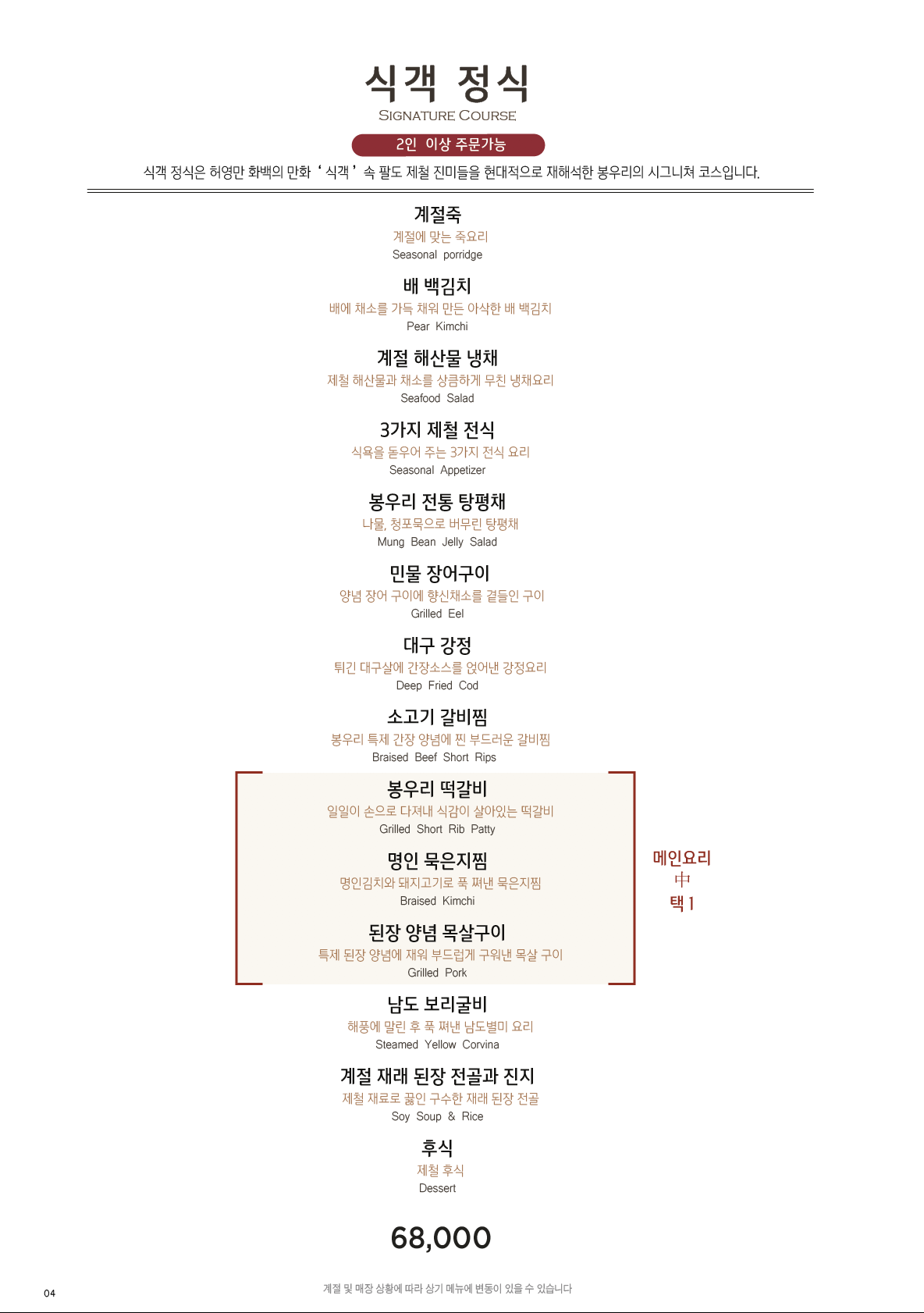 1인당 하나씩 식사 메뉴를 선택할 수 있습니다.
