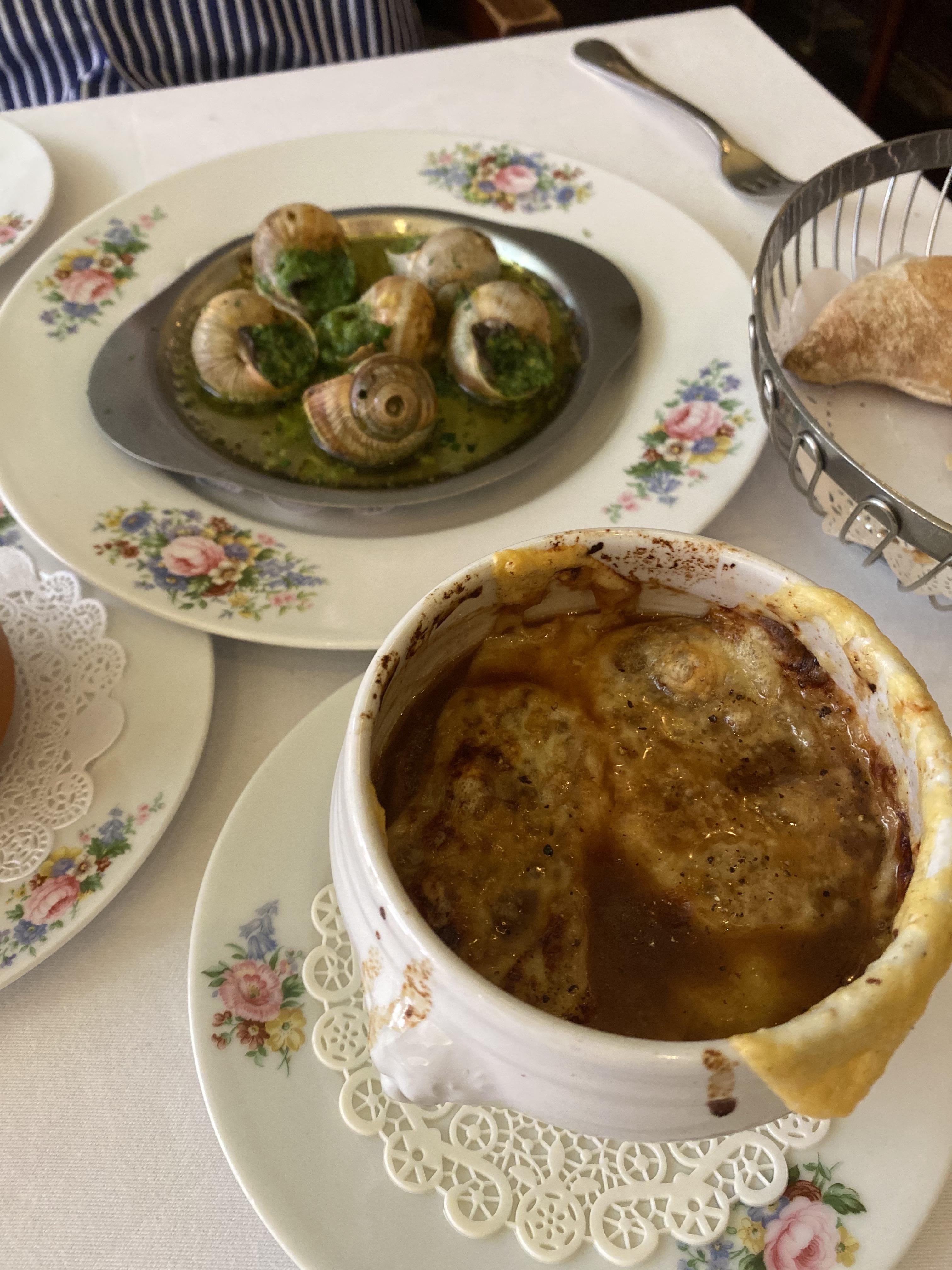 프렌치 어니언 수프와 에스까르고 달팽이입니다.